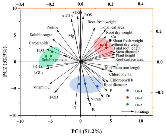 In the first quadrant, positive correlations were observed among the fresh and dry weight of shoot and root, total leaf area, stem diameter, plant height, total root length, root surface area, Ca, and ROS. These indices displayed a strong negative correlation with I-GLs, T-GLs, vitamin C, POD, and N, and they were connected to the forward axis of PC1. PC2 showed a positive correlation to carotenoids, soluble protein, soluble sugars, A-GLs, H2O2, OXO, proline, and Mg, and it negatively correlated to maximum root length, root diameter, chlorophyll a, chlorophyll b, nitrate, K, P, Zn, and S.