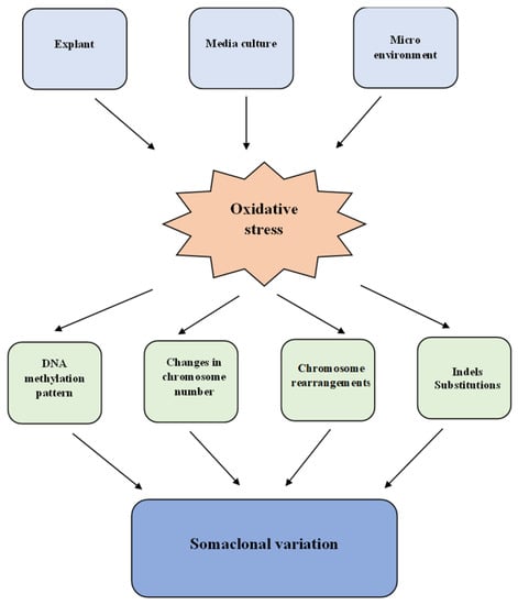 Plants cultivated in vitro could develop different modified characteristics and genetic variability due to somaclonal variation []. The genetic bases of somaclonal variation are gene mutations and also the rearrangements of chromosomes, karyotype changes [,,], or epigenetic modifications driven by hyper or hypo-methylation []. Most of these are induced by oxidative stress [], as shown in Figure 1.