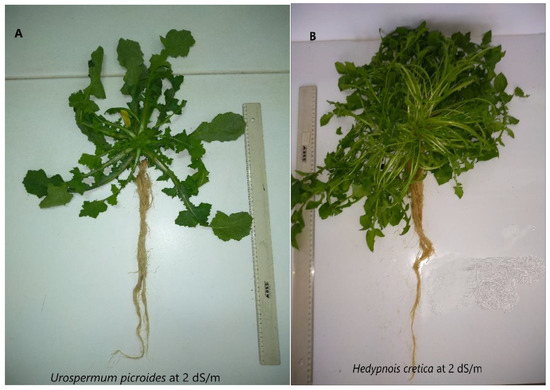 Plants of Urospermum picroides (A) and Hedypnois cretica (B) grown at 2 dS m−1.