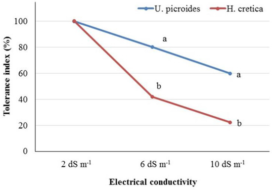 In order to assess the tolerance of the tested species, the salinity tolerance index was determined based on the recorded values of dry weight of plants in the control (EC2) and the studied salinity levels (Figure 2). Comparing the tolerance index of the two plants, U. picroides and the control treatment, it could be suggested that U. picroides was more tolerant than H. cretica in either the EC6 or EC10 treatments. According to the literature, there is a strong correlation between Na content in leaves, with tolerant genotypes showing a lower accumulation of Na than less tolerant ones [49]. This finding agrees with our study, since the increase in Na content in leaves and roots under high salinity levels (EC10) was lower in the case of U. picroides than H. cretica (increased by 3.85 times vs. 12.08 times in the case of leaves for U. picroides and H. cretica, respectively; and 15.46 times vs. 17.12 times in the case of roots for U. picroides and H. cretica, respectively). Moreover, Tao et al. [50] reported a wide variability between different wheat genotypes in values of the salinity tolerance index while Anshori et al. [51] highlighted the importance of using various salinity tolerance indices for the selection of elite rice genotypes in breeding programs.