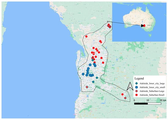 Adelaide is a growing city and is the capital of South Australia, with a 3260 km2 area, 1.3 million people and a large population concentrated in small suburbs []. Private and public-led UA is dominant in South Australia []. 59% of people with back or front yard gardens are estimated to be engaged in some form of UA in South Australia []. Information on land area, cost and distance from the city centre of Adelaide, South Australia (Figure 1) were randomly selected from 40 land parcels advertised for sale on a widely used real estate website https://www.realestate.com.au (accessed on 25 December 2020). Land parcel areas ranged from 154 m2 to 2705 m2. The farthest distances were up to 57 km in Adelaide, representing a trip from the Adelaide Central Business District (CBD). These distances are taken as indicative of the proximity of the land parcel (production) to the market and allow us to identify any potential relationships that emerge between UA production scale and transport requirements.