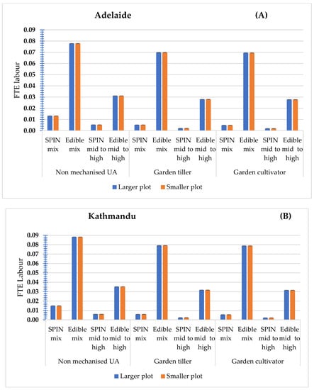 Owing to the diversity in approaches to UA, the FTE is calculated based on the operating and non-cultivating labour data required to produce urban vegetables using two distinct labour scenarios: a high productivity scenario derived from the Small Plot Intensive (SPIN) farming method (i.e., a highly efficient labour use case for commercial urban farming) [] and a high labour input derived from the Edible Garden project (i.e., urban gardening) [].