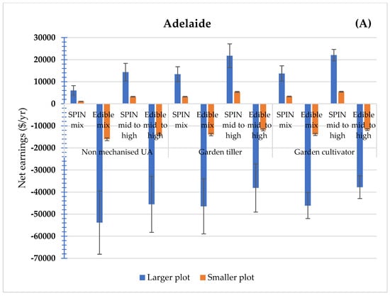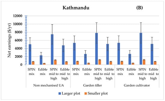 The Nepalese currency was converted to an Australian dollar value for ease of comparison of case study findings (87 Nepalese rupees equivalent to $1AUD based on the typical rate observed in 2022). The model assumes a typical retail price can be achieved for UA produce, either through selling direct to consumers or for self-provisioning (opportunity cost). The average retail price of mixed vegetables (possible value generated from the combination of the root, legumes, fruits and leafy vegetables, including brassicas) and mid to high-value vegetables (possible retail value through the cultivation of tomato, capsicum, beans, coriander, broccoli, lettuce, spinach, basil and celery) was acquired from a review of prices currently promoted by the Adelaide central market in Adelaide (available online: https://shop.adelaidecentralmarket.com.au accessed on 10 June 2022) and the Kalimati Fruit and Vegetable Market in Kathmandu (available online: https://ramropatro.com/vegetable accessed on 10 June 2022 ).