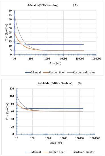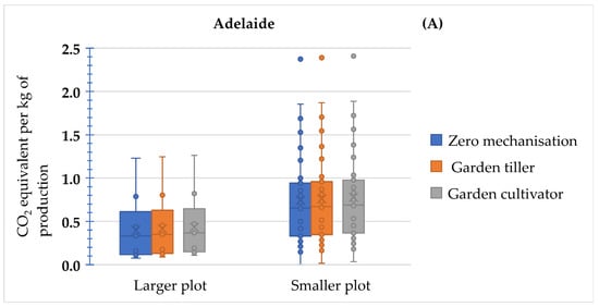This analysis highlighted the importance of labour-efficient workflow (particularly non-cultivation labour), as well as the potential improvement from scale-appropriate mechanisation as part of the economic viability of UA. This was shown to be particularly relevant in high-wage settings such as Adelaide. From the analysis of the CO2 emissions and comparing this with studies of conventional commercial vegetable production, the fuel emissions from machine use during production appear comparable between UA and commercial production, but a larger fraction of emissions has emerged from the assumed use of petrol-driven small vehicles driven to distribute produce. Small vehicles (cars) are deemed inappropriate for distributing UA products. Interestingly, Kafle et al. [] showed the distribution as a minor part of the economic cost. This current study shows that whilst distribution might not impact economic costs; it could undermine the case for environmental benefit (reduced GHG emissions through transport) by adopting UA.