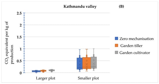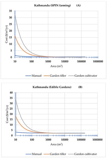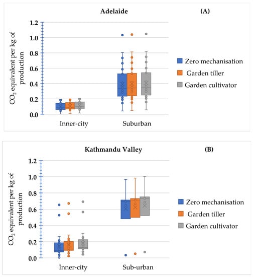 Some past studies have made and/or repeated unfounded claims about the potential for UA to reduce emissions; others have demonstrated a firm foundation, e.g., Kulak et al. [], but in the context of specialised case studies that may not be broadly generalisable; others may have a firm foundation but have not addressed the issue of employment potentiality and economic viability of production or explored GHG emissions in the context of mechanisation (which may be vital for economic viability). This study examines the potential socio-economic and environmental problems of current uncontrolled environmental UA in practice with an emphasis on employment, earnings, scale appropriateness and carbon emissions and suggests the key considerations for sustainable UA practice based on different distances and scales. This study uses 40 distinct land parcels of different sizes and distances to represent different scales and locations of potential urban farms to explore their impact on production and distribution. Two cities are used: Adelaide, South Australia and Kathmandu Valley, Nepal, to provide divergent development contexts. This study helps to develop a sustainable UA system based on the interplay between Scale-appropriate mechanisation, an optimal crop mix, labour planning and transport mode that links the product with the market through alternative distribution mechanisms.