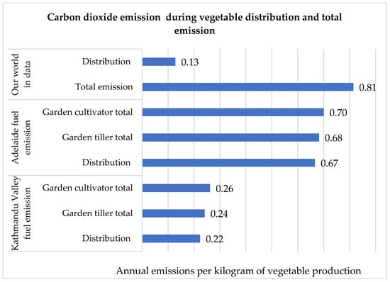 Carbon dioxide is a major source of Green House Gases (GHGs). The distance and area-wise calculation of CO2 emissions during tilling and distribution were estimated in this study. Other emissions (such as N2O emissions from soil, agrochemical use, on-farm postharvest activities, embodied emissions from the water supply for irrigation and machine emissions) were assumed to be common to vegetable production at both UA scale and commercial scale, and only the fuel emission from a machine used during production and car emission during the distribution of UA produce were considered. So, the total amount of carbon dioxide emission per kg of production, Etot. (kg CO2 equivalent) from production to distribution activities were determined based on the available information using the following method: