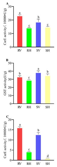 3.3. Expression Patterns of Detoxification-Related P450, GST and CarE