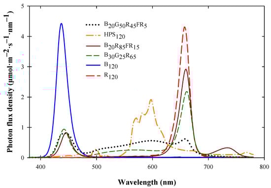 SL treatments consisted of either 460 W HPS fixtures (LR48877; P.L. Light Systems, Beamsville, ON, Canada), 631 W LED fixtures (VYPR 2p; Fluence, Austin, TX, USA), 325 W LED fixtures (LumiGrow Pro 325; LumiGrow, Emeryville, CA, USA), 600 W LED fixtures (LX601G, Heliospectra, Göteborg, Sweden), a combination of 72 W LED fixtures (HortiLED MULTI, P.L. Light Systems) and 625 W LED fixtures (LumiGrow Pro 650E, LumiGrow), or 625 W LED fixtures (LumiGrow Pro 650E; LumiGrow). SL treatments, defined by the PFD delivered at each 100 nm waveband of B (400–500 nm), G (500–600 nm), R (600–700 nm), and FR (700–800 nm) radiation, were B7G60R44FR9 (HPS120), B20G50R45FR5, B20R85FR15, B30G25R65, B120, or R120, respectively. The spectral distribution of the SL fixtures was measured at crop height in ten random locations throughout each compartment with a spectrometer (LI-180; LI-COR Biosciences) and are presented in Figure 1. The PPE of each SL treatment were estimated according to Sager et al. (1988) and are presented in Table 3.