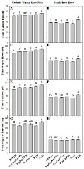 (A,B) time to visible flower bud, (C,D) time to open flower, (E,F) time to harvest, and (G,H) stem length at harvest of godetia ‘Grace Rose Pink’ and stock ‘Iron Rose’ in response to SL spectrum, pooled over two replications. SL treatments consisted of either 460 W HPS fixtures (HPS120; LR48877; P.L. Light Systems, Beamsville, ON, Canada), 631 W LED fixtures (B20G50R45FR5; VYPR 2p; Fluence, Austin, TX, USA), 325 W LED fixtures (B20R85FR15; LumiGrow Pro 325; LumiGrow, Emeryville, CA, USA), 600 W LED fixtures (B30G25R65; LX601G, Heliospectra, Göteborg, Sweden), a combination of 72 W LED fixtures (B120; HortiLED MULTI, P.L. Light Systems) and 625 W LED fixtures (R120; LumiGrow Pro 650E, LumiGrow), or 625 W LED fixtures (LumiGrow Pro 650E; LumiGrow). Means not followed by the same letter are significantly different by Tukey–Kramer honestly significant difference (HSD) test at p ≤ 0.05. Bars represent the mean and error bars indicate standard error.