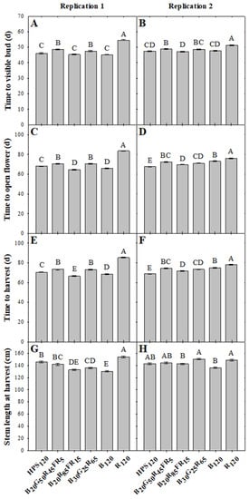 (A,B) Time to visible flower bud, (C,D) time to open flower, (E,F) time to harvest, and (G,H) stem length at harvest of snapdragon ‘Potomac Royal’ in response to SL spectrum over two replications. SL treatments consisted of either 460 W HPS fixtures (HPS120; LR48877; P.L. Light Systems, Beamsville, ON, Canada), 631 W LED fixtures (B20G50R45FR5; VYPR 2p; Fluence, Austin, TX, USA), 325 W LED fixtures (B20R85FR15; LumiGrow Pro 325; LumiGrow, Emeryville, CA, USA), 600 W LED fixtures (B30G25R65; LX601G, Heliospectra, Göteborg, Sweden), a combination of 72 W LED fixtures (B120; HortiLED MULTI, P.L. Light Systems) and 625 W LED fixtures (R120; LumiGrow Pro 650E, LumiGrow), or 625 W LED fixtures (LumiGrow Pro 650E; LumiGrow). Means not followed by the same letter are significantly different by Tukey–Kramer honestly significant difference (HSD) test at p ≤ 0.05. Bars represent the mean and error bars indicate standard error.