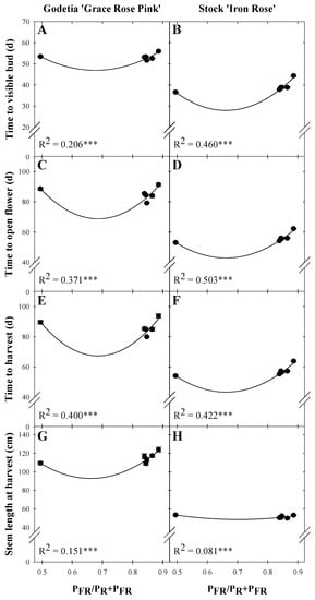 Influence of estimated phytochrome photoequilibrium (PFR/PR+PFR) of supplemental lighting treatments (A,B) on time to visible bud, (C,D) time to open flower, (E,F) time to harvest, and (G,H) stem length at harvest of godetia ‘Grace Rose Pink’ and stock ‘Iron Rose’. Black symbols represent means; error bars represent standard error. R2 values are presented; *** indicate model significance at p < 0.00001. Coefficients are presented in Table 5.