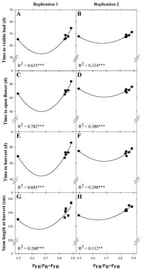 Influence of estimated phytochrome photoequilibrium (PFR/PR+PFR) of supplemental lighting treatments on (A,B) time to visible bud, (C,D) time to open flower, (E,F) time to harvest, and (G,H) stem length at harvest of snapdragon ‘Potomac Royal’ during replications 1 and 2. Black symbols represent means; error bars represent standard error. R2 values are presented; ** and *** indicate model significance at p < 0.001 and p < 0.0001, respectively. Coefficients are presented in Table 5.