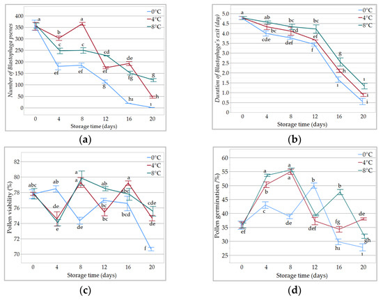 The effect of storage temperature and time interaction on (a) the number of B. psenes; (b) duration of Blastophaga’s exit; (c) pollen viability; (d) pollen germination. Different small letters indicate a significant difference according to Duncan test, p < 0.05.