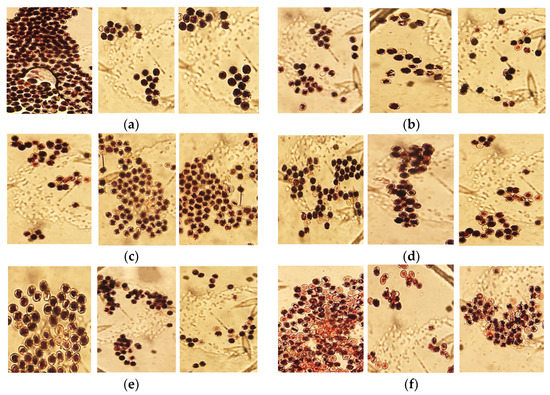 Comparison of pollen viability from storage temperatures 0, 4 and 8 °C (from the left). Storage time: (a) 0 days; (b) 4 days; (c) 8 days; (d) 12 days; (e) 16 days; (f) 20 days.