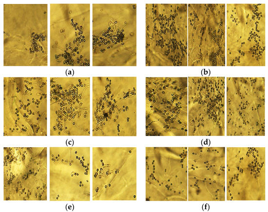 Comparison of pollen germination from storage temperatures 0, 4 and 8 °C (from the left). Storage time: (a) 0 days; (b) 4 days; (c) 8 days; (d) 12 days; (e) 16 days; (f) 20 days.