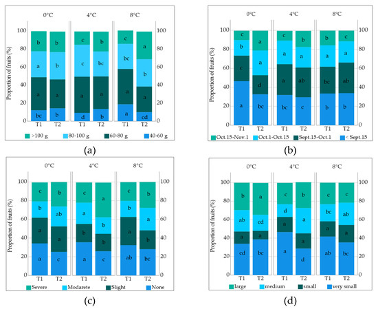 Proportion of fruits (%) according to (a) time of ripening; (b) fruit weight; (c) ostiole damage; (d) fruit cavity at interaction different storage temperature × pollination frequency. Different small letters indicate a significant difference according to Duncan test, p < 0.05 (T1: 4-day intervals, T2: 8-day intervals pollination, Sept.: September, Oct.: October, Nov.: Novermber).