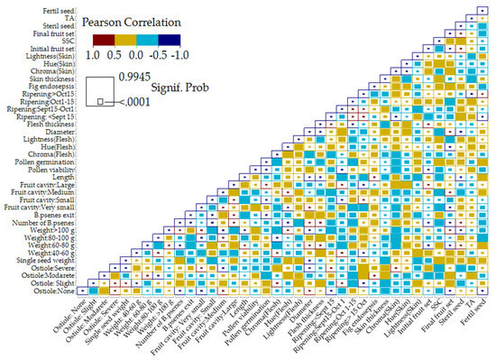 The number of B. psenes showed a strong positive correlation with fruit set, slight ostiole damage, and the proportion of fruit weighing 60–80 g, while it had a moderate positive correlation with the duration of Blastophaga’s exit and the proportion of fruit with a very small and small cavity. In contrast, it was negatively correlated with the proportion of fruit weighing more than 100 g, the proportion of fruit with a large cavity, diameter, length, flesh thickness and sterile seeds. The duration of Blastophaga’s exit showed a positive correlation with fruit set, pollen germination the proportion of fruit with a medium cavity and skin thickness but a negative correlation with the proportion of fruit with a large cavity. The single seed weight was correlated negatively with the proportion of fruits weighing 40–60 g, slight ostiole damage, and the number of fertile seeds, and positively with the proportion of fruits weighing 80–100 g and severe ostiole damage. The number of fertile seeds correlated positively with no ostiole damage, the proportion of fruit with a small cavity and the proportion of fruit ripening before September 15, while it correlated negatively with the proportion of fruit with a large fruit cavity, skin thickness, the proportion of fruit ripening after October 15 and TA.