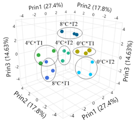 Three−dimensional scatter diagrams of the relationships among the storage temperature and pollination frequency interaction. (T1: 4-day intervals pollination, T2: 8-day intervals pollination; Prin1: Principal compenent 1, Prin2: Principal compenent 2, Prin3: Principal compenent 3).