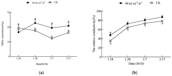 The changes in the MDA content and the relative conductivity in the leaves are shown in Figure 1a,b. As seen from the graphs, the treatment caused cellular lipid peroxidation damage in the leaf membrane. The MDA content of the treated leaves was significantly higher than that of the CK leaves at all times, except for on 18 January, when it was not significantly different from that of the CK. The relative conductivity in leaves of both the treatment and the CK exhibited an increasing trend and was significantly higher in the treatment than in the CK.