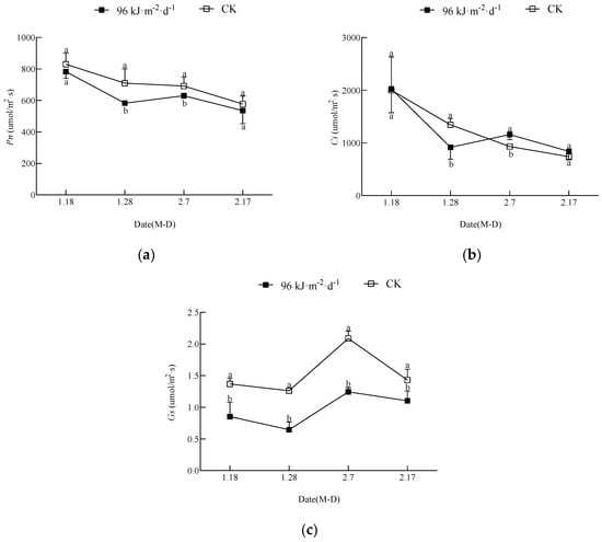 The changes in leaf photosynthetic physiological indicators are shown in Figure 2, and they indicated that the treatment caused stomatal limitation and nonstomatal limitation of photosynthesis. The Pn of both the treatment and the CK decreased in general, and the CK Pn was significantly higher than that of the treatment at all times. The Gs of the treatment and the CK changed along similar single−peaked curves, and both reached the highest value on 7 February, but the Gs of the treatment was significantly lower than that of the control from the start of the experimental treatment. The Ci of both the treatment and the CK showed a decreasing trend, and the Ci of the treatment was significantly higher than that of the CK thereafter, except on 28 January, when the Ci of the treatment was significantly lower.