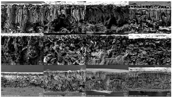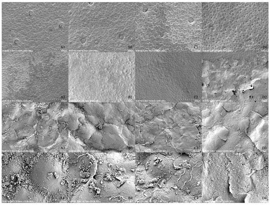 The results of the scanning electron microscopy observation are shown in Figure 3. The figure indicates that the treatment severely destroyed the leaf surface protective tissue, surface morphology and stomatal structure. The CK stomatal number was greater, the stomatal area was larger, the leaf surface was flatter and smoother, the mesophyll cells were clearer, the distribution was neater and denser, and a thin waxy layer was distributed on the surface (A1 and C1). The treatment stomata number was significantly reduced, the stomatal area was smaller, and the stomata were shrunken. Moreover, the guard cells lost water and contracted, and then the stomata sunken inward (B1 and D1). With the extension of irradiation time, the treatment leaf surface became rougher, the cell outline became unclear, and local fractures appeared; then, the leaf tissue cells were severely damaged.