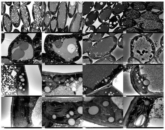 As shown in Figure 5, enhanced UV-B radiation severely damaged the protoplast and chloroplast submicrostructure. The chloroplasts of the CK were well structured, with a more regular oval shape and were arranged close to the cell wall, with a complete double membrane structure, and the mitochondria were distributed close to the chloroplasts. The chloroplast basal granule lamellae were closely stacked, with a clear structure and orderly arrangement, and a large number of starch granules and a small number of both plastid and osmiophilic granules were distributed throughout. Compared with the chloroplasts of the CK, those of the treatment were severely swollen and distributed in a subspherical shape, and some of the chloroplast membranes were locally disrupted, with large gaps between them and the cell walls. Mitochondria were difficult to identify, the number of starch and plastid granules was reduced, and there were almost no osmiophilic granules. The structure of the chloroplast basal granule lamellae was distorted, swollen and deformed, and some of the lamellae were blurred and disordered. Moreover, the lamellae appeared dilated.