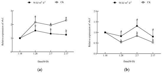 As shown in Figure 6, the treatment inhibited the leaf carbon dioxide fixation process by inhibiting rbcL expression. However, the inhibition of the carbon dioxide fixation process was alleviated by the promotion of rbcS expression. The expression level of rbcL in leaves increased significantly during the initial stage of the experiment and then decreased significantly. The expression level of rbcS first decreased and then increased; however, the expression level of rbcS in the treatment was significantly higher than that in the CK on 7 February.