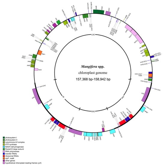 The chloroplast genome of Mangifera had the typical angiosperm circular tetrad structure, with genome lengths ranging from 157,368 to 158,942 bp. Chloroplasts of Mangifera species had 129 genes, including 84 protein-coding genes, eight rRNA genes, and 37 tRNA genes. There was no obvious difference in the average GC content across any of the species. In addition, the genotype, quantity, and GC content of the chloroplast genome of Mangifera species were highly consistent with those of other reported chloroplast genomes, such as Pyrus betulifolia and Pinus armandii [,].