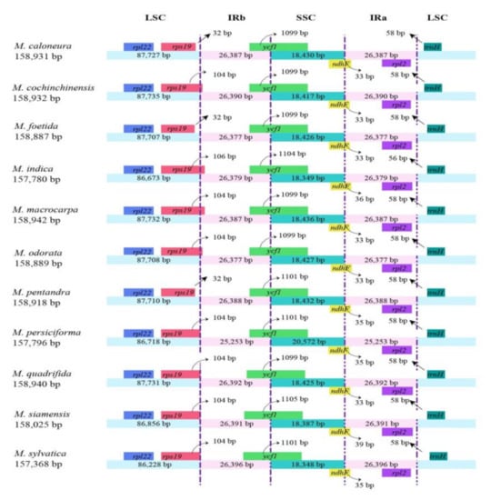 Comparison of large single-copy (LSC), small single-copy (SSC), and inverted repeat (IR) borders among the 11 chloroplast genomes of Mangifera.