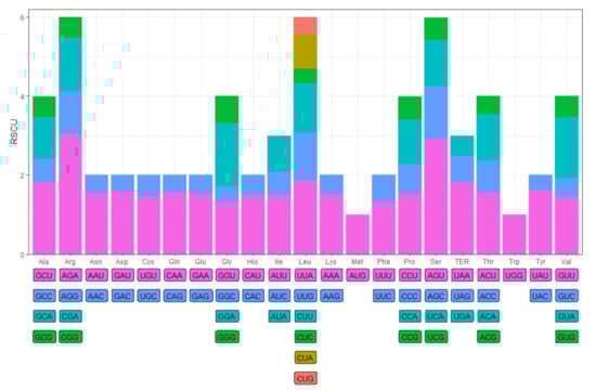 - Ren, G.P.; Dong, Y.Y.; Dang, Y.K. Codon codes: Codon usage bias influences many levels of gene expression. Sci. Sin. 2019, 49, 839–847. [Google Scholar] [CrossRef]