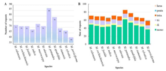 We used the MicroSatellite Identification Tool (MISA) website (https://webblast.ipk-gatersleben.de/misa/, accessed on 8 April 2022) to detect simple sequence repeats (SSRs) in the chloroplast genomes of the 11 Mangifera species [] and compared their types, quantities, and distribution. The parameters were set as follows: repetition unit/minimum repetition times: 1/10, 2/5, 3/4, 4/3, 5/3, and 6/3. In addition, if the distance between two SSRs was less than 100 bp, the two SSRs were considered composite microsatellite SSRs.