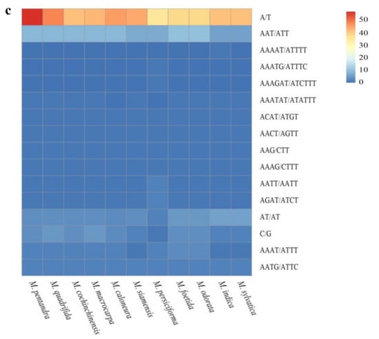 (A) and (B) indicate the numbers of simple sequence repeats (SSRs) and SSR types detected in the 11 Mangifera chloroplast genomes. (C) indicate distribution of the 11 types of SSR repeat units among Mangifera sequence.
