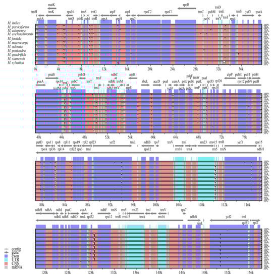 To determine the differences among M. indica and other species, we used Ubuntu 18.04 LTS software to convert the annotation file of Mangifera sequences, which output the gene location information in TXT format, and then used the mVISTA tool for comparative genomics (https://genome.lbl.gov/vista/mvista/submit.shtml, accessed on 15 April 2022). We then analyzed the sequence differences among the other 10 species based on the Shuffle-LAGAN global comparison model [] with M. indica (GenBank accession: MN711724) as a reference.