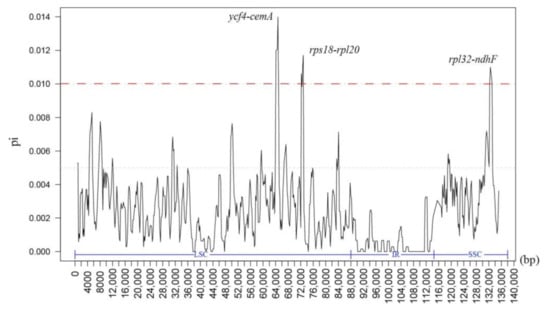 The variation in chloroplast IR sequences in the 11 Mangifera species was significantly smaller than that in LSC and SSC regions, and variation in noncoding regions (intergenic and intronic) was significantly higher than that in coding regions, which was consistent with the pattern of genomic sequence variation in Schisandra chinensis and other angiosperms [,]. These findings indicate that noncoding regions have much higher rates of change than coding regions. Furthermore, nucleotide polymorphism analysis showed that the Mangifera species had three regions of high variation at ycf4-cemA (63,712–65,340 bp), rps18-rpl20 (71,789–73,220 bp), and rpl32-ndhF (131,885–133,418 bp). Niu et al. [] have previously noted that the ycf4-cemA region has a high rate of polymorphism. However, the three hypervariable regions identified by Niu et al. [] were located in the LSC region, while the mutation hotspots in this study were located in the LSC region and the SSC region. This inconsistency may be due to the selection of different Mangifera species in the two studies. In addition, IR region sequences are highly conserved, which is consistent with the results of our mVISTA analysis. This may be because the structural characteristics of the inverted repeats in the IR regions make the IR region sequence less likely than the LSC region to accrue mutations []. Regardless, the three mutation hotspots identified in this study can be considered candidates for the development of DNA barcoding for Mangifera plants.