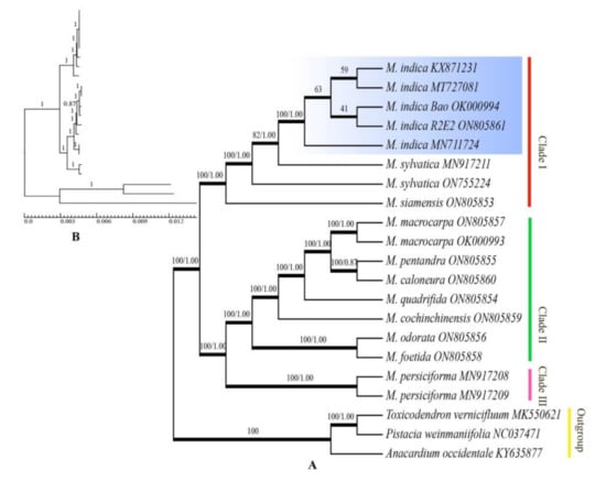 Phylogenetic relationship of Mangifera species inferred by maximum likelihood (ML) and Bayesian inference (BI) methods using whole chloroplast genomes. Note: (A): Phylogram of Mangifera species; (B): BI tree with branch lengths.