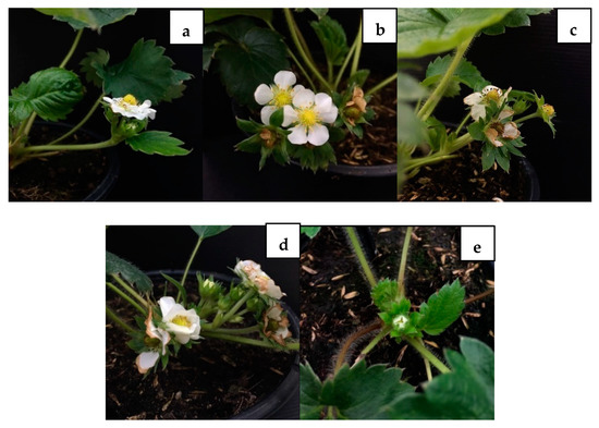 Inflorescence of strawberry cv. Pharachatan 80. (a) After 4 weeks of vernalization at 4 °C for 1 week. (b) After 4 weeks of vernalization at 4 °C for 2 weeks. (c) After 4 weeks of vernalization at 2 °C for 1 week. (d) After 4 weeks of vernalization at 2 °C for 2 weeks. (e) After planting for 8 weeks (control).