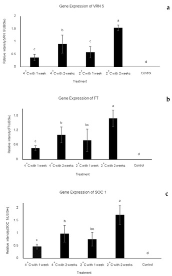The results show an interaction between the two factors. Vernalization at 2 °C for 2 weeks showed the highest expression levels of VRN5, FT and SOC1 genes. The vernalization at 4 °C for 2 weeks showed high expression levels for those genes. Notably, between 1 and 2 weeks vernalization, the shorter period induced less VRN5, FT and SOC1 gene expression. On the other hand, the flowering genes could not be detected in non-vernalization treatment (control) (Figure 3).