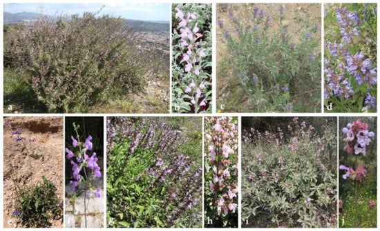 S. pomifera ssp. pomifera (Figure 1i) is an endemic shrub of Greece found in Crete and the Peloponnese []. It is a strongly aromatic perennial evergreen plant (80 cm tall), bearing pink or violet flowers (Figure 1j) in spring to early summer on slightly curving flower stocks.