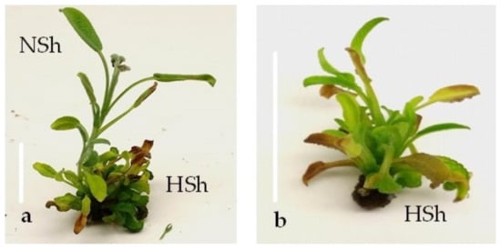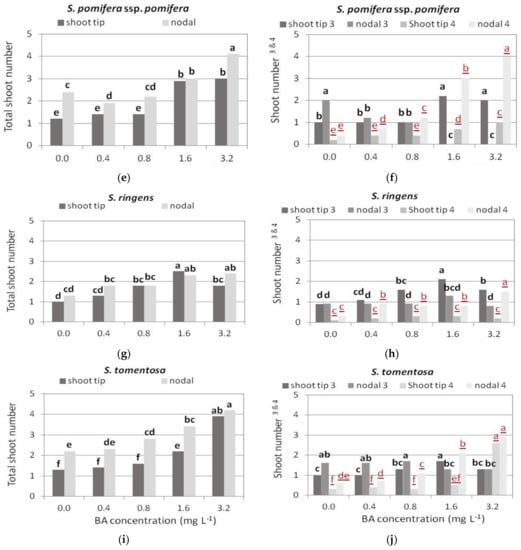In S. pomifera ssp. pomifera, shoot tip explants showed the highest response to produce shoots (94%) on Hf medium (Figure 4e), and only 2% produced only hyperhydrated shoots (Figure 4f), while single node explants responded in a lower percentage (74%), and 12% of the responded explants produced only hyperhydrated shoots (Figure 4e,f). The gradual increase in BA concentration induced a proportional decrease in explant response, and an increase in hyperhydration (Figure 4e,f). The negative effect of BA on shoot production was stronger in single node explants, which at the two highest BA concentrations, responded at very low percentages (20%) and produced only hyperhydrated shoots (Figure 4e,f).