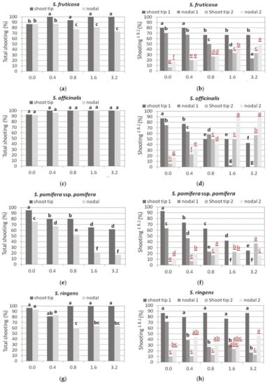 In S. ringens, the shoot tip explants had a consistent response for shoot production in all media tested compared to single node explants, whose response decreased at BA concentrations of 0.8 mg L−1 and higher (Figure 4g). In addition, shoot tip explants produced normal shoots at much higher percentages (78–88%), compared to single node explants (Figure 4h). Further, hyperhydration was more pronounced in single node explants, especially at the highest BA concentration (Figure 4h).