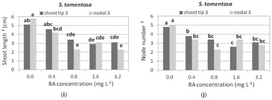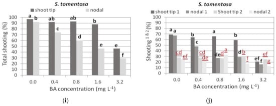 In S. tomentosa, shoot tip explants responded at higher percentages to produce shoots, both normal and hyperhydrated, compared to single node explants, and Hf medium induced the highest response, similar to 0.4 and 0.8 mg L−1 BA media, while the response percentage was almost halved in the medium with 3.2 mg L−1 BA (Figure 4i,j). The percentage of hyperhydrated explants was not affected by the medium plant growth regulators in both explant types (Figure 4j).