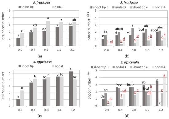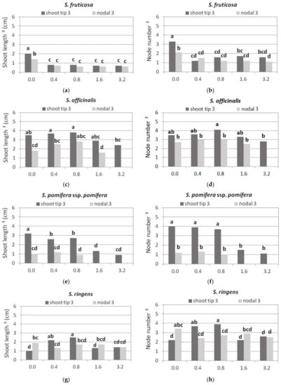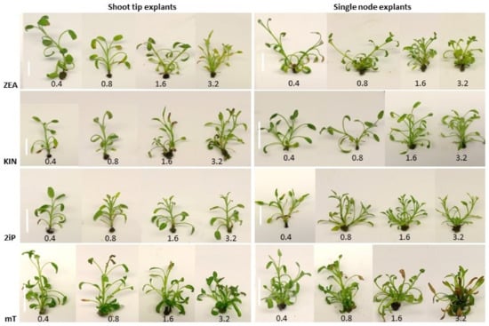 Shoot tip and single node explants, 0.6 cm long, were excised from the microshoots of in vitro cultures (on MS medium with 0.4 mg L−1 BA and 0.01 mg L−1 NAA) of S. fruticosa and S. officinalis, and cultured on MS medium with 30 g L−1 sucrose. The medium was either Hf (control) or supplemented with 0.01 mg L−1 1-naphthaleneacetic acid (NAA) in combination with a cytokinin of five different types, i.e., BA, zeatin (ZEA), kinetin (KIN), 6-(γ,γ-dimethylallylamino) purine (2iP), or meta-topolin (mT), at four concentrations, i.e., 0.4, 0.8, 1.6, and 3.2 mg·L−1.