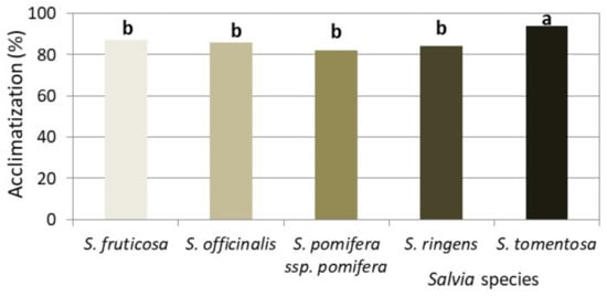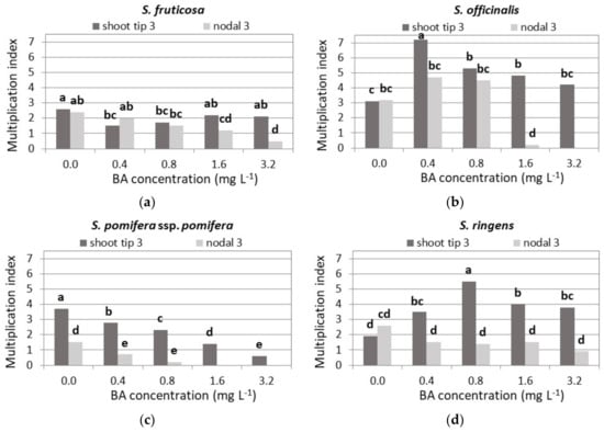 Aiming to increase the plant material to be used in experiments on shoot proliferation, up to six subcultures (the number depending on Salvia spp.) on MS medium supplemented with 0.4 mg L−1 6-benzyladenine (BA) and 0.01 mg L−1 1-naphthaleneacetic acid (NAA) were performed for each Salvia species.