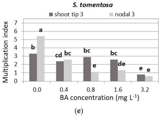 Shoot tip explants resulted in higher multiplication indices than single node explants, except in the HF medium, which reached its highest value in the 0.8 mg L−1 BA medium (Figure 8d).