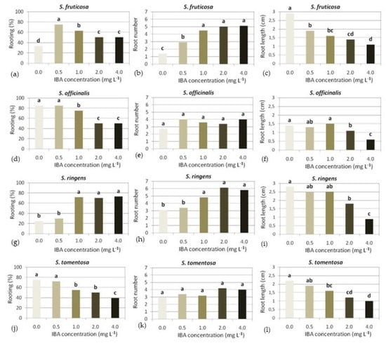 The in vitro rooting of medicinal Lamiaceae herbs, including Salvia spp., presented no difficulties [,,,,,,,,,,,,,], and in a number of these species, auxin supplementation was not necessary for rooting [,,,,]. In contrast, S. fruticosa microshoots rooted only in the presence of auxin []. Half-strength MS medium supplemented with IBA at 0.5–1.5 mg L−1 and occasionally up to 4.0 mg L−1 has been the most appropriate protocol, with a few exceptions in which full-strength MS medium was used [,].