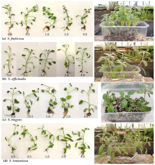 - Göçer, H.; Yetişir, H.; Ulaş, A.; Arslan, M.; Aydin, A. Plant growth, ion accumulation and essential oil content of Salvia officinalis Mill. and S. tomentosa L. grown under different salt stress. KSU J. Agric. Nat. 2021, 24, 505–514. [Google Scholar]