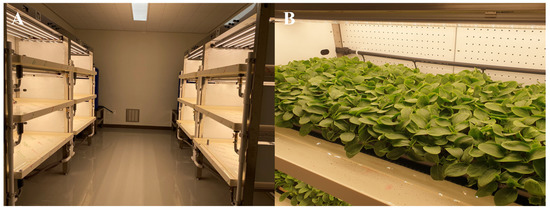 (A) The closed transplant production system with artificial lighting, which were composed of the three-layered shelf and (B) cucumber seedlings cultivated in the closed transplant production system with artificial lighting.