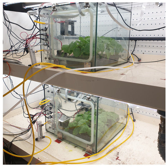 Measuring cucumber seedlings’ whole canopy using a semi-open chamber system for the measurement of the crop whole canopy gas exchange rate during the cultivation period.