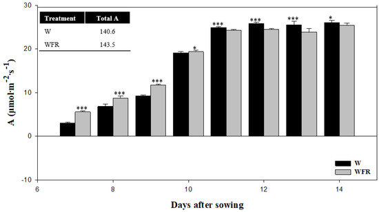 Figure 3 shows the mean An for each treatment in this study. The mean CO2 concentration in each growth chamber was maintained at 529.8 μmol mol−1. The mean An was below 0 μmol m−2 s−1 until 6 days after sowing, and WFR treatment was significantly lower than W treatment. In other words, they did more respiration than photosynthesis. At 7 days after sowing, the mean An was greater than 0 μmol m−2 s−1. The from 7 to 10 days after sowing showed a higher tendency in the WFR treatment than W treatment (Figure 3). From 11 days after sowing, the W treatment showed a tendency in which the mean A of WFR treatment was reversed. However, the difference was only 0.65 μmol m−2 s−1. This was thought to be due to the increase of LAI, and increasing the plant height and leaf area of WFR treatment. Nevertheless, the measured total net assimilation rate was high in the WFR treatment, and it was judged that this resulted in better growth in the WFR treatment. This state was maintained until 14 days after sowing. The total mean An during the cultivation period was 140.6 and 143.5 μmol m−2 s−1 for W and WFR, respectively. This result showed no significant difference of the shoot and root dry matter weight between treatments.