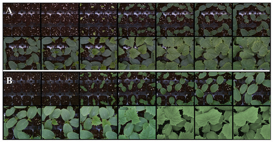 Image data for each treatment acquired through the imaging system during the cultivation period: (A) conventional white LEDs treatment; and (B) white LEDs with added far-red light treatment.